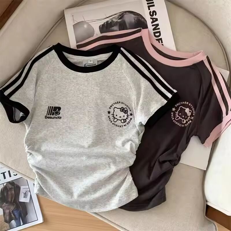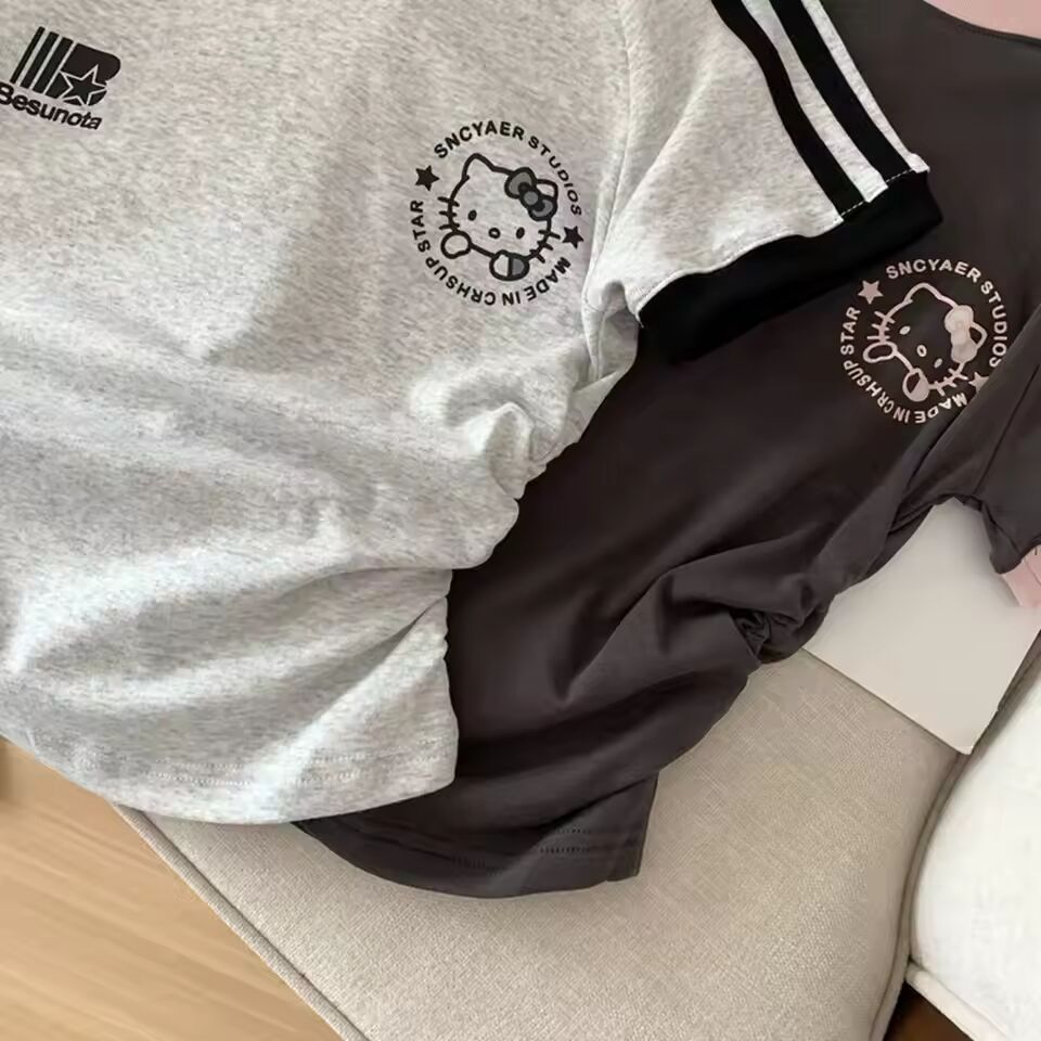 Sanrios Hello Kittys Girl Cotton T-Shirt Anime Summer Short-Sleeved Tops Cute Casual Loose Sportswear Cartoon Crew Neck Pullover